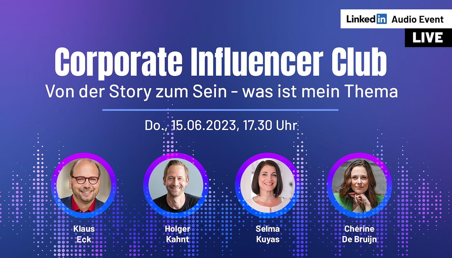 In diesem LinkedIn Audio-Event geben unsere Gästinnen Impulse, um Corporate Influencer auf ihrer Reise vom reinen Storytelling hin zum authentischen Sein zu begleiten. Dazu laden 🎤🎧 Holger Kahnt ich am 15. Juni zu einem 30-Minuten-Talk ins LinkedIn Audio ein.