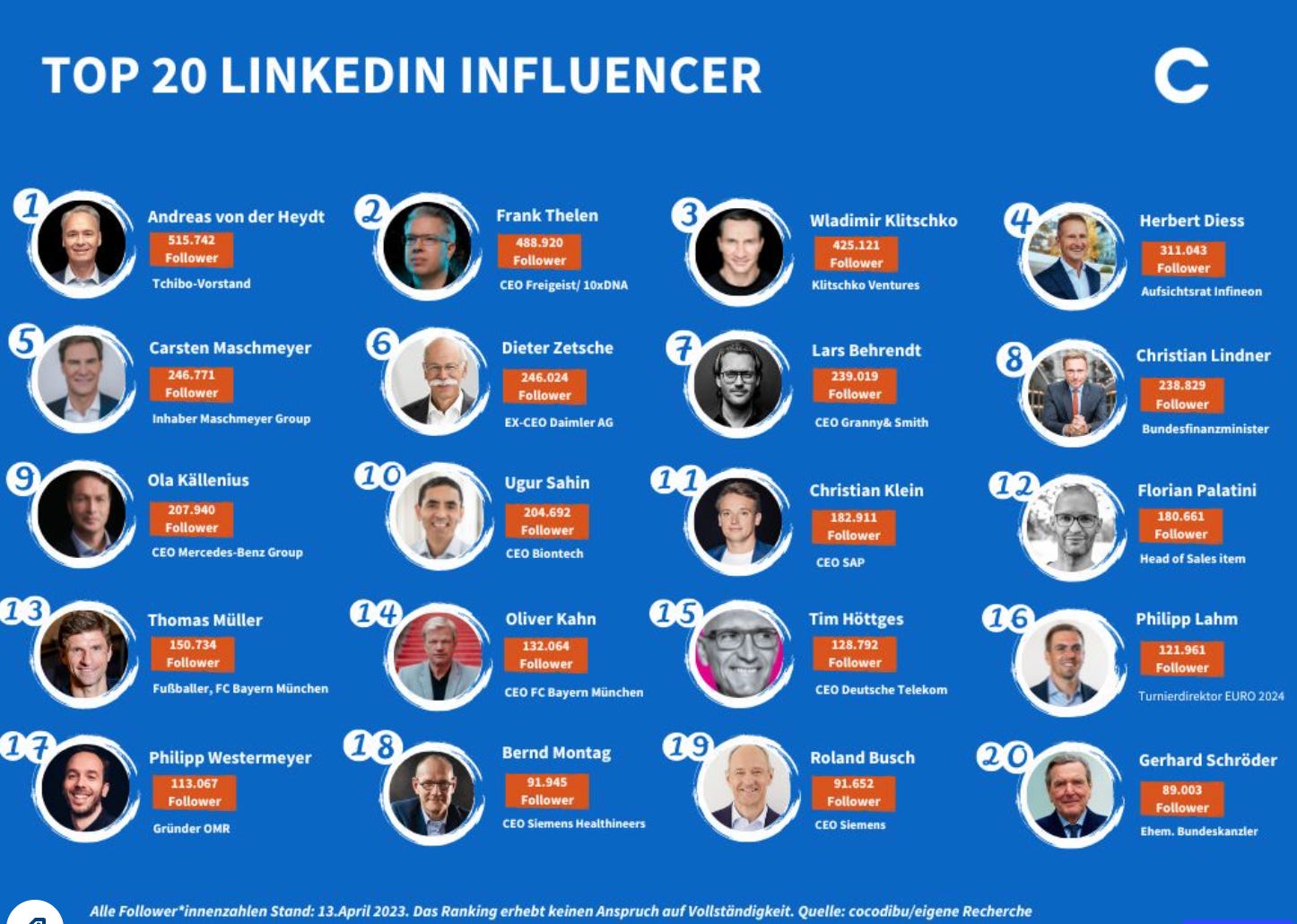 Wer sind die Männer im deutschsprachigen Raum mit den meisten Followern auf LinkedIn? Diese Frage hat sich die Agentur Cocodibu gestellt, nachdem sie zuvor schon anlässlich des Weltfrauentags eine Liste der 20 followerstärkten Frauen auf LinkedIn (im deutschsprachigen Raum) publiziert hatte.