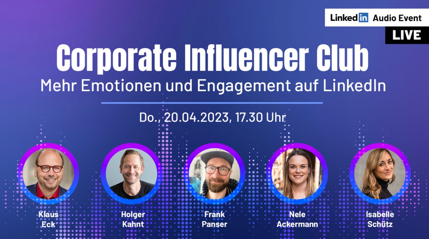 Diesmal moderieren 🎤🎧 Holger Kahnt und ich das LinkedIn Audio. Als Gäst:innen sind am Donnerstag Nele Ackermann, Isabelle Schütz und Frank Panser dabei.